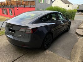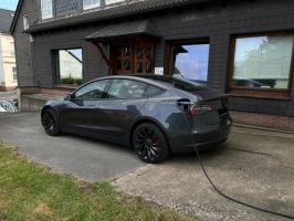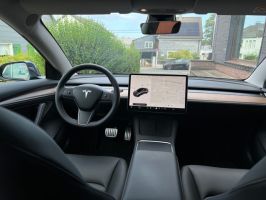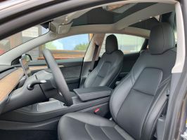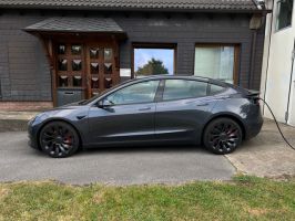 TESLA Model 3 PERFORMANCE in Midnight Silver Metallic, mit schwarzer Innenausstattung, Wärmepumpe, Doppelverglasung vordere Seitenscheiben und elektrischer Heckklappe
