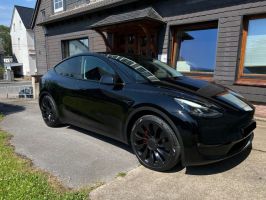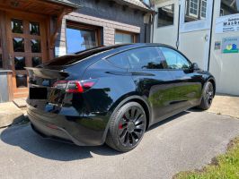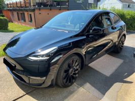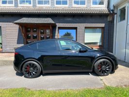 TESLA Model Y Performance in schwarz, mit schwarzer Innenausstattung